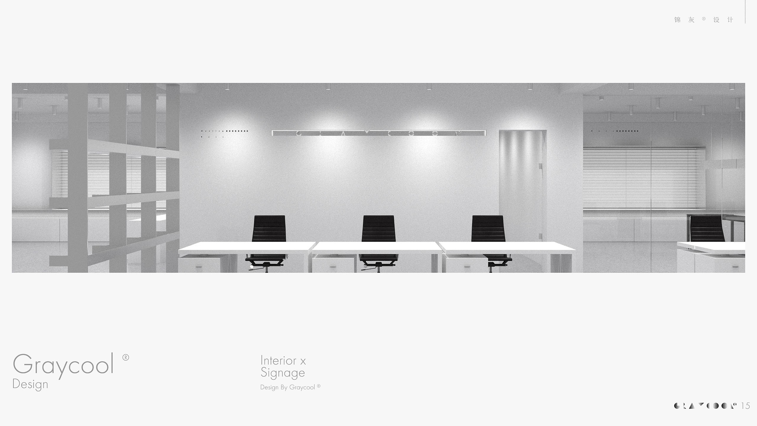 不同明暗、材质的“灰”构成了锦灰®工作空间的底色。低调冷静,发人深省,而后创作的一切精彩都从这张白纸开始。导视箭头采用了与LOGO一致的设计逻辑,用圆、三角和正方绘制。Graycool®的LOGO标识像工艺品般被陈列在方或长方的橱窗内,并采用镜面反射的方式发光。
